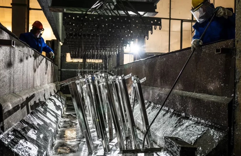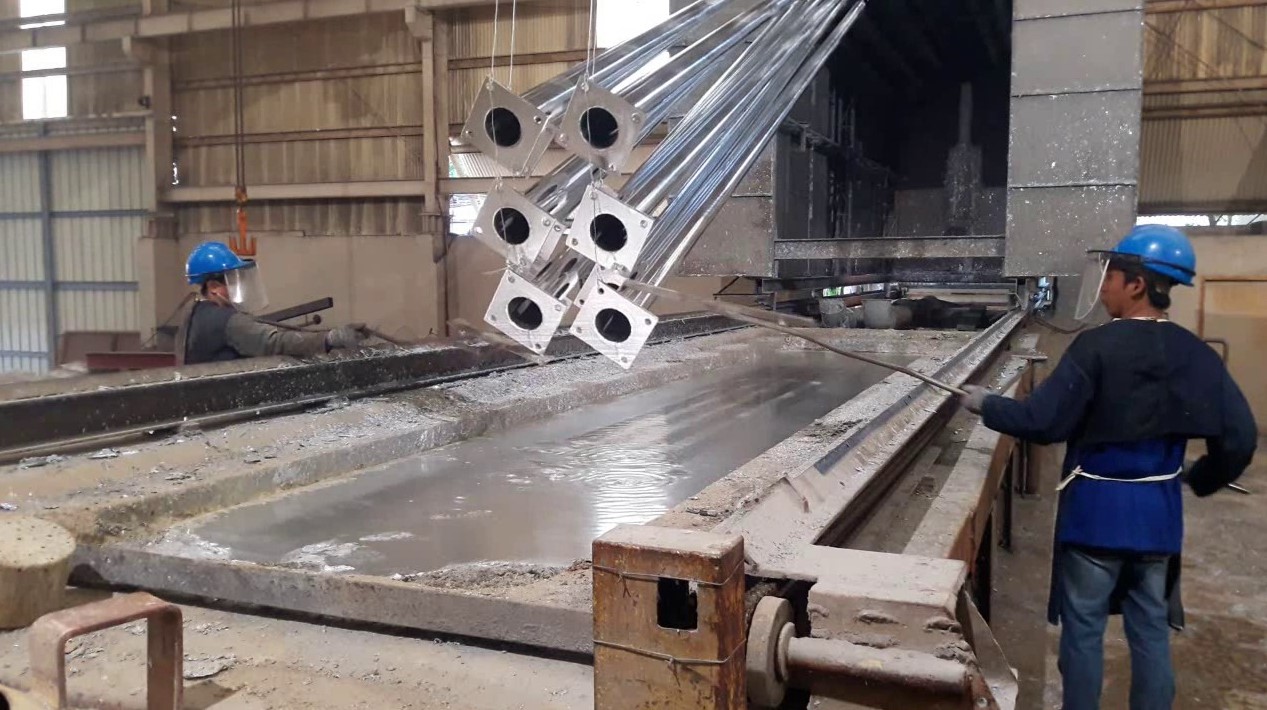 Immersion in Molten Zinc: The cleaned steel is submerged in a molten zinc bath at controlled temperature. The zinc reacts with the iron in the steel to form several zinc-iron alloy layers.