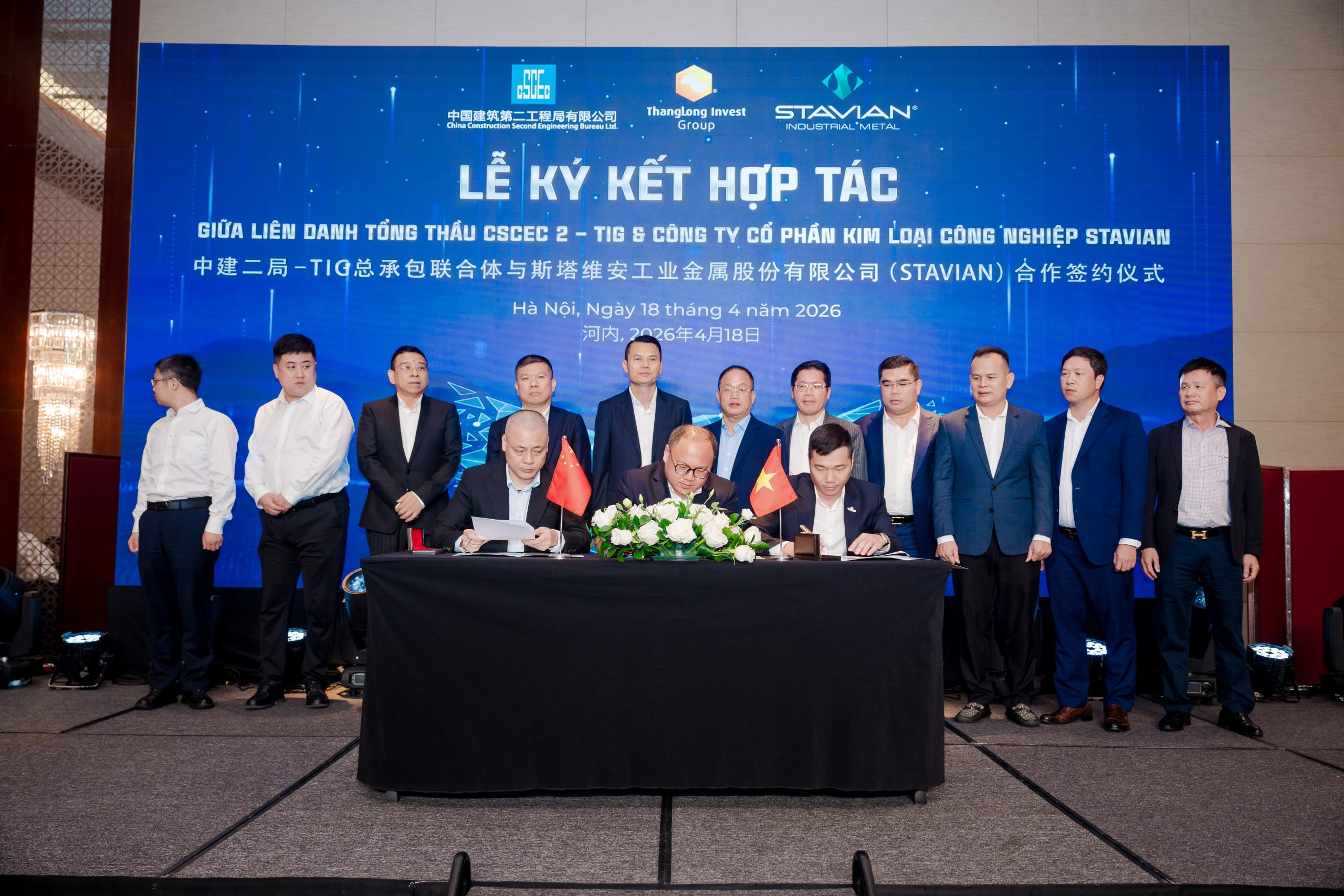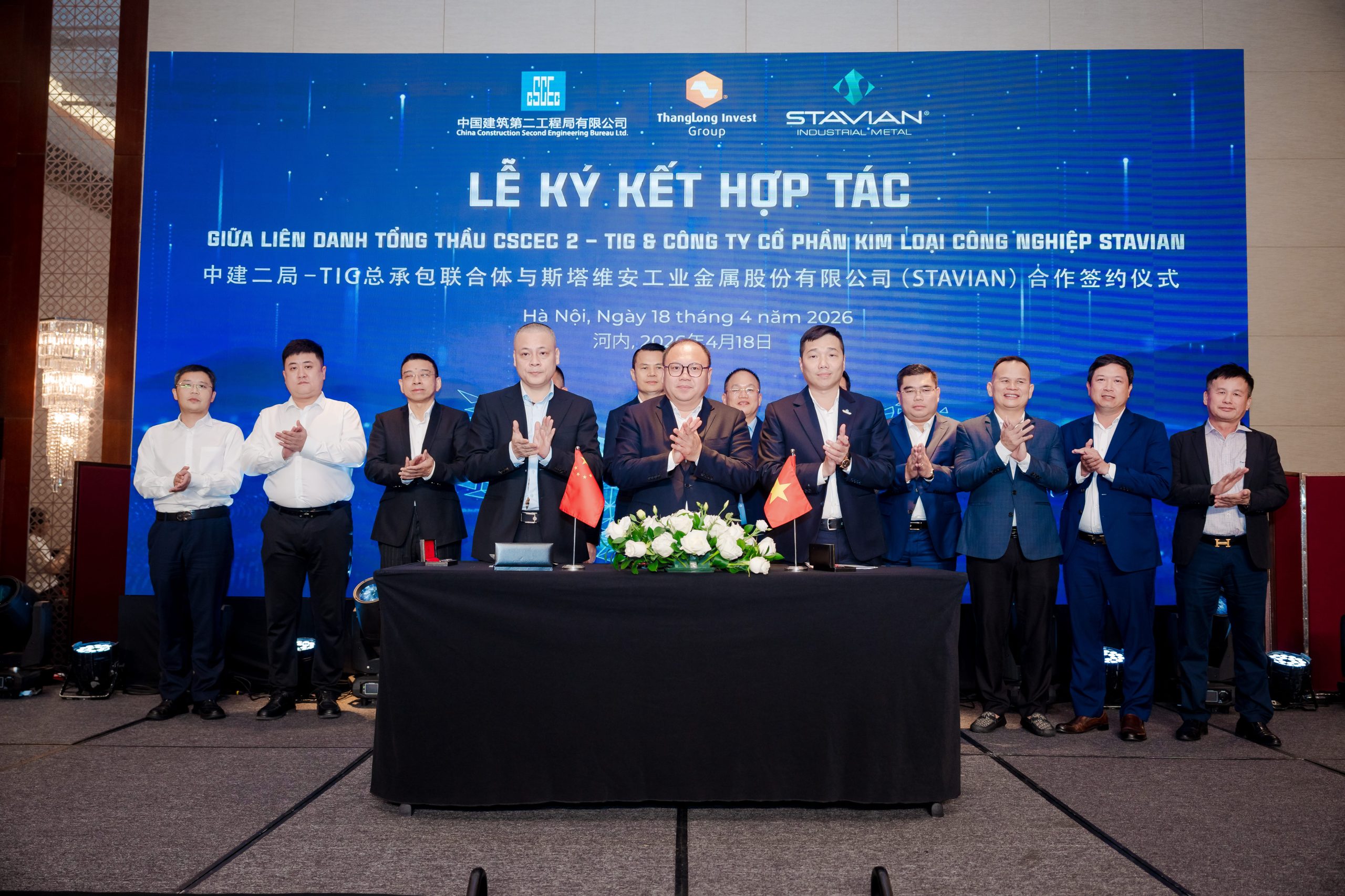 On April 18, 2026, in Hanoi, Stavian Industrial Metal Joint Stock Company signed a Memorandum of Understanding (MOU) on construction investment cooperation with the CSCEC 2 – TIG Consortium, within the framework of the International EPC Contractors Cooperation Forum and the official launch ceremony of the consortium.